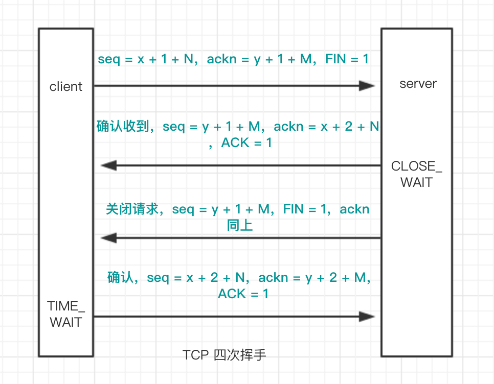 第一次是连接的某一端 A 请求断开连接,发送报文段给 B,设置 seq = x 和 ackn = y,另外加一个标识位 FIN,表示已经没有数据发送了,请求断开。