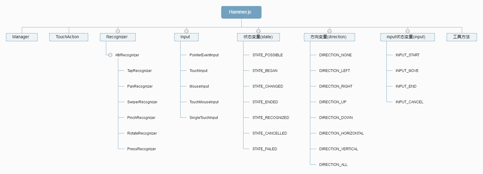 - 采用了 Manager 的设计模式,Manager类负责管理全局的状态和流程,输入/手势识别器/触摸动作实例的创建和销毁。(manager.js)